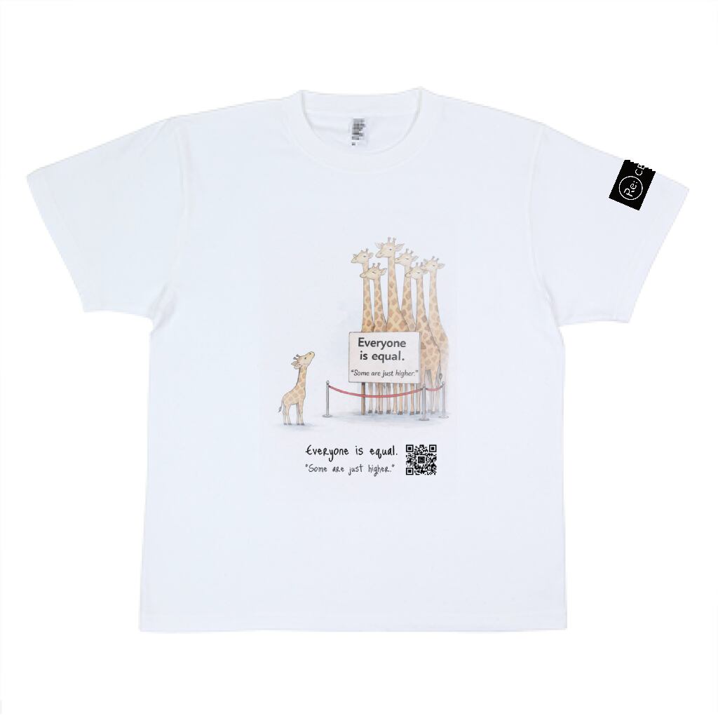 背の高いキリンたちが並ぶ中、その前に立てられた「みんな平等」という看板。しかし、看板の下には、背の低いキリンが一人寂しく立っています。